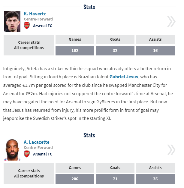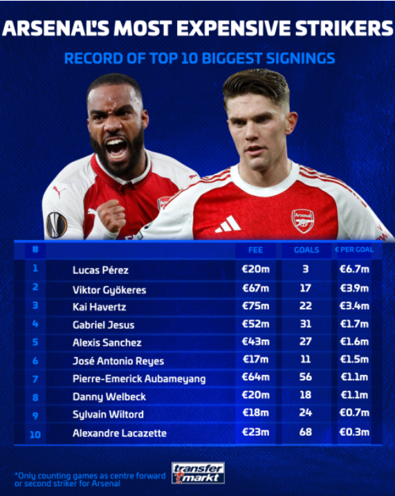 令人担忧的是,这是阿森纳队史十大最贵前锋中第二差的表现。只有卢卡斯·佩雷斯(温格时代那个有些被遗忘的签约)的情况更糟,他花费2000万欧元加盟后只打进了3球。