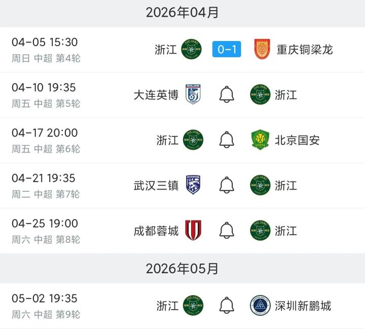 2026年4月5日,中国足球超级联赛第四轮场序第30场,浙江职业足球俱乐部绿城队与重庆铜梁龙足球俱乐部队的比赛在浙江省黄龙体育中心体育场举行。