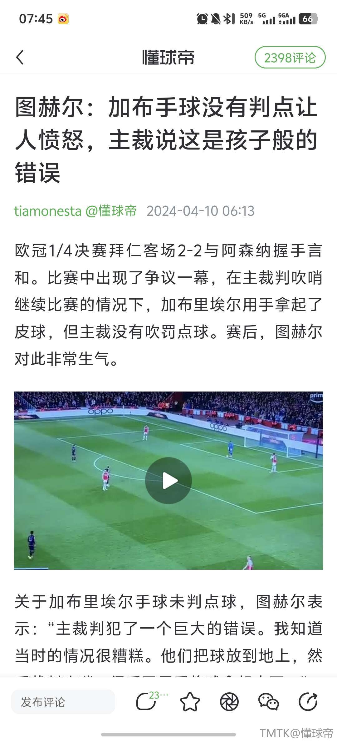 对于这次判罚,伊图拉尔德-冈萨雷斯表示:“这个球根本没有任何解释空间,就是一个非常明显的判罚。主裁显然是对规则理解出了问题,而且当时也完全没有反应过来。这是我近几年看到最严重的技术性失误之一。”