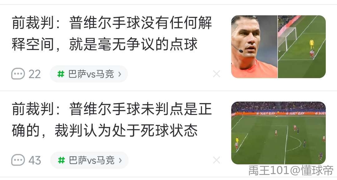 西班牙电台节目Carrusel Deportivo的裁判评论员伊图拉尔德-冈萨雷斯在分析巴塞罗那对阵马德里竞技一战中的争议判罚时表示,下半场开始后,普维尔在禁区内的手球没有任何解释空间,就是一次非常明确的点球,但主裁科瓦奇既没有吹罚,VAR也没有进行复核。这次争议出现在下半场开局阶段。尽管少打一人,巴萨在这一阶段的整体表现依然出色,球队也推进到了对方禁区。胡安-穆索将球放到地上准备恢复比赛,这位阿根廷门将随后把球传给马克-普维尔,后者用手碰球后再将球重新投入比赛。巴萨全队随即对这次判罚提出抗议,因为这名马竞后卫在禁区内明显手球,但科瓦奇没有做出任何表示,这次判罚甚至连VAR都没有介入检查。