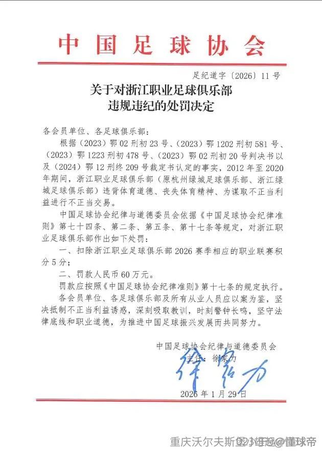 面对球员的赛场违纪行为,浙江职业足球俱乐部秉持“不包庇、不纵容”的严肃态度,坚守职业俱乐部的管理底线。在中足联处罚决定公布后,浙江FC第一时间同步发布内部处罚通告,对米特里策处以6万欧元(约合47.8万元人民币)罚款,并在全队及俱乐部全系统内通报批评,以严明纪律强化球员管理。