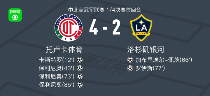 北京时间4月9日中北美冠军联赛 1/4决赛首回合,托卢卡体育对阵洛杉矶银河。托卢卡体育卡斯特罗破门,保利尼奥帽子戏法。洛杉矶银河加布里埃尔-佩茨破门,罗伊斯破门。最终比分托卢卡体育 4-2 洛杉矶银河。