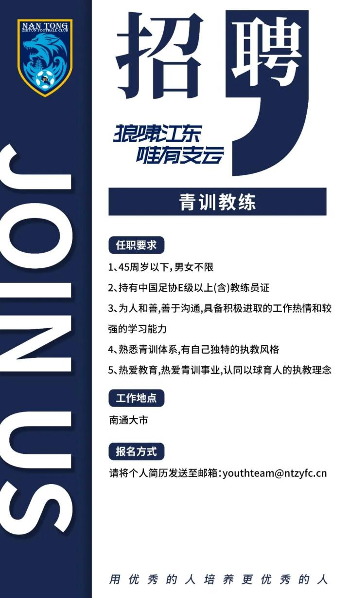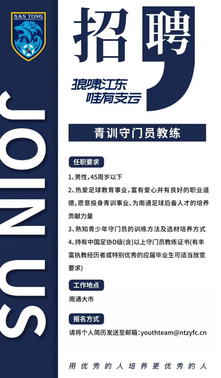 懂球帝首页>动态> 南通支云官方:诚聘青训教练及青训守门员教练