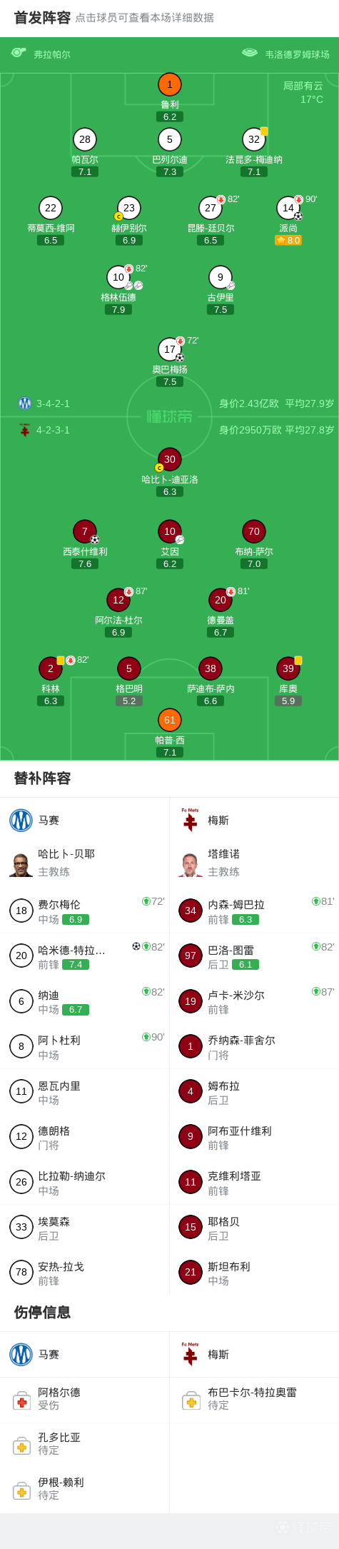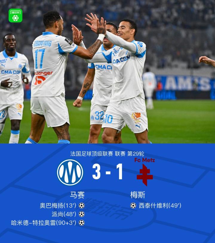 北京时间4月11日法国足球顶级联赛 联赛 第29轮,马赛主场对阵梅斯。马赛奥巴梅扬破门,派尚破门,哈米德-特拉奥雷破门,格林伍德送出2次助攻。梅斯西泰什维利破门。最终比分马赛 3-1 梅斯。