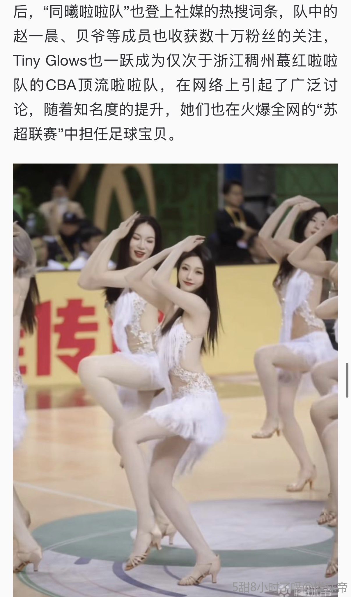 除了球员,同曦在其他领域依旧能为俱乐部带来讨论度:2024-25赛季,同曦主场揭幕战,球迷们看到了全新的同曦啦啦队Tiny Glows,队中成员们面容姣好,身材火辣,衣着性感服装翩翩起舞,成为CBA赛场上一道特殊的靓丽风景线,赛后,“同曦啦啦队”也登上社媒的热搜词条,队中的赵一晨、贝爷等成员也收获数十万粉丝的关注,Tiny Glows也一跃成为仅次于浙江稠州蕞红啦啦队的CBA顶流啦啦队,在网络上引起了广泛讨论,随着知名度的提升,她们也在火爆全网的“苏超联赛”中担任足球宝贝。
