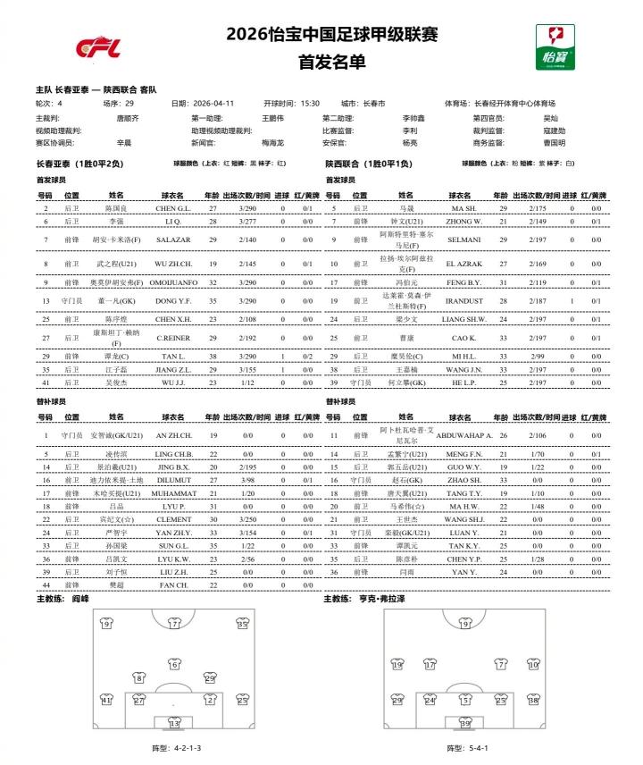 04-11 23:29中甲第4轮,长春亚泰队主场逆转2:1胜陕西联合队...