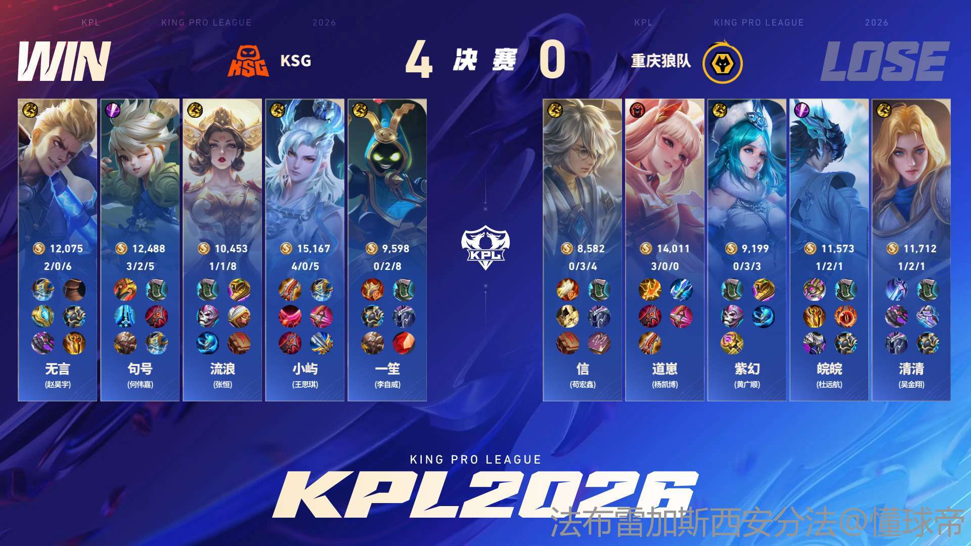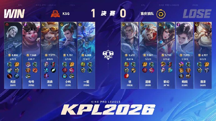北京时间4月11日,2026KPL春季赛决赛,KSG 4-0横扫重庆狼队,夺得队史首冠!