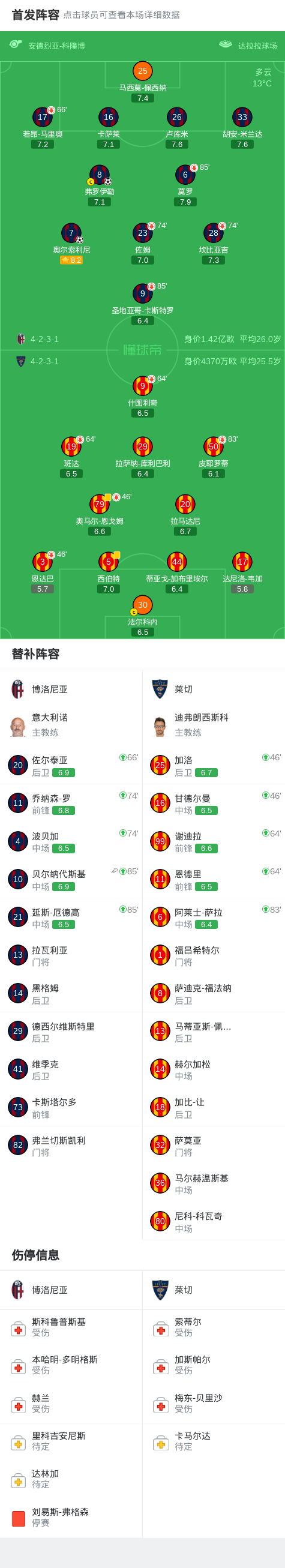 北京时间4月13日意大利足球顶级联赛 联赛 第32轮,博洛尼亚主场对阵莱切。博洛尼亚弗罗伊勒破门,奥尔索利尼破门。最终比分博洛尼亚 2-0 莱切。