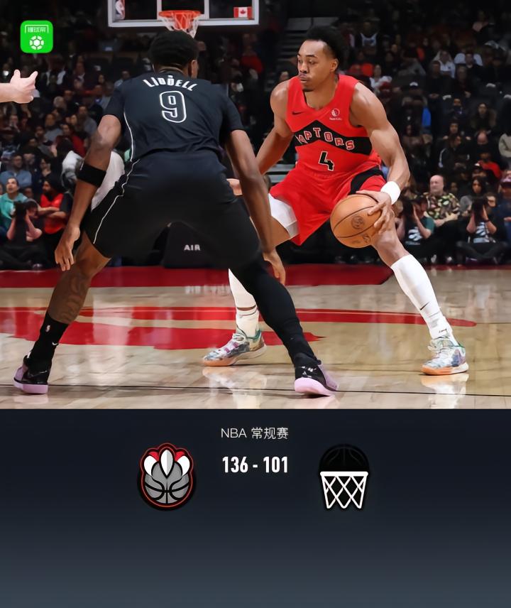 第四节猛龙RJ-巴雷特拿下9分,篮网泰森-艾蒂安拿下4分,最终猛龙136-101战胜篮网