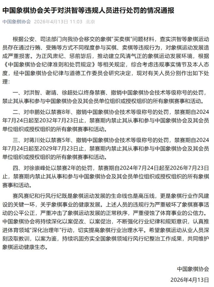 4月13日,中国象棋协会发布关于对洪智等违规人员进行处罚的情况通报,三位选手处以终身禁赛。