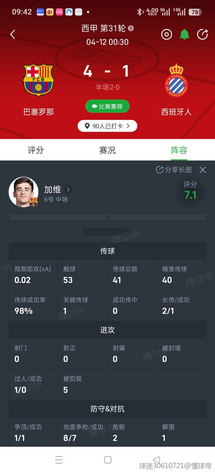 被加维防破防了 这场比赛加维的防守意识是巴萨中场球员里最好的,进攻端确实表现不多,主要是帮助中后场控球,加维下去以后少一个接应点,中后场出球明显困难了不少。