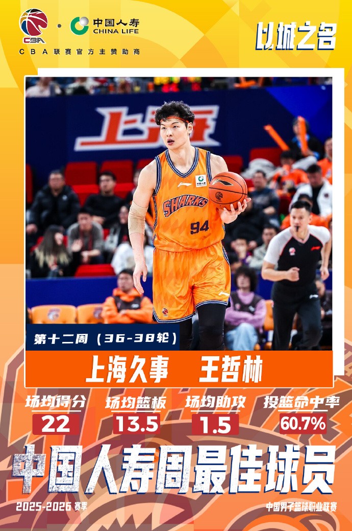 扫描下载懂球帝首页>动态> 场均22分13.5板,官方:王哲林当选常规赛第十二周最佳球员