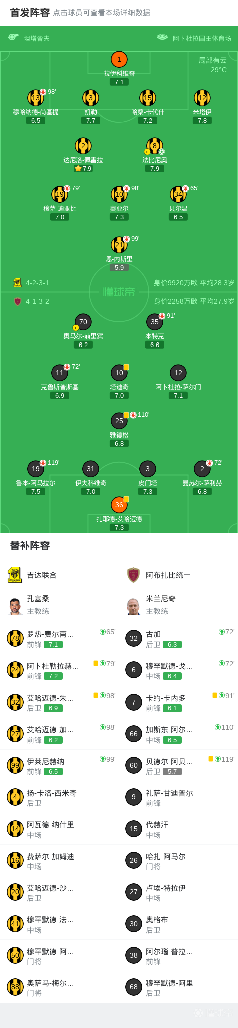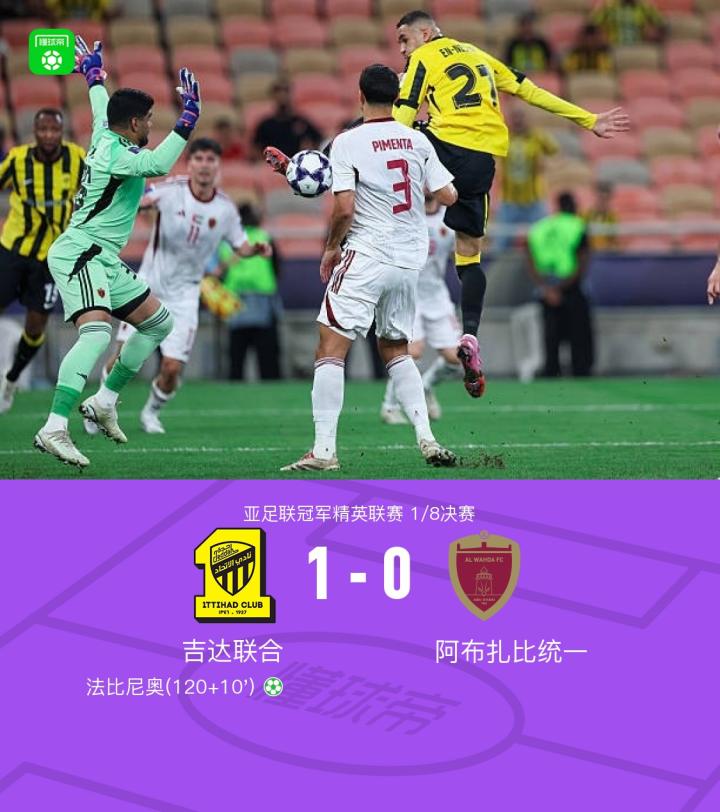第120+6分钟,最后时刻奥博德造点,法比尼奥绝杀,吉达联合1-0阿布扎比