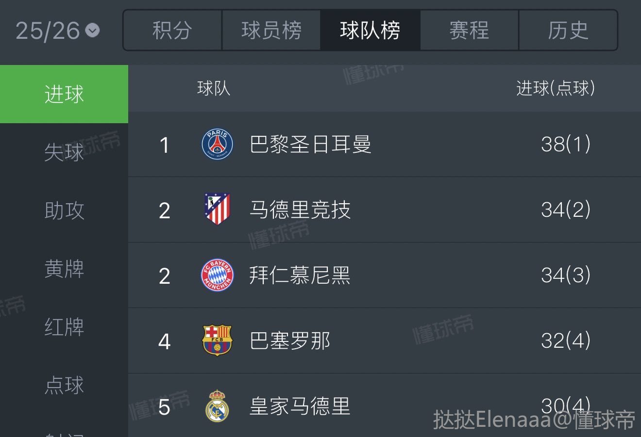 在14场比赛中打入34球,马竞是欧冠进球第二多的球队(在周三皇马比赛前与拜仁并列),而他们26个失球也是所有球队中第二多的(仅次卡拉巴赫的30球)。