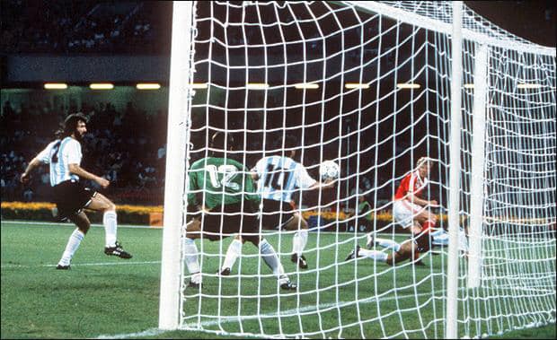 在这个时间被吹了一个点球,阿根廷全队很难接受,纷纷抗议,但无济于事。西德队后卫布雷默站在了点球点上,冷静地射门。虽然戈伊科切亚判断对了方向,但布雷默这个点球罚得很刁钻。皮球钻入立柱内侧,西德队取得了1-0的领先。
