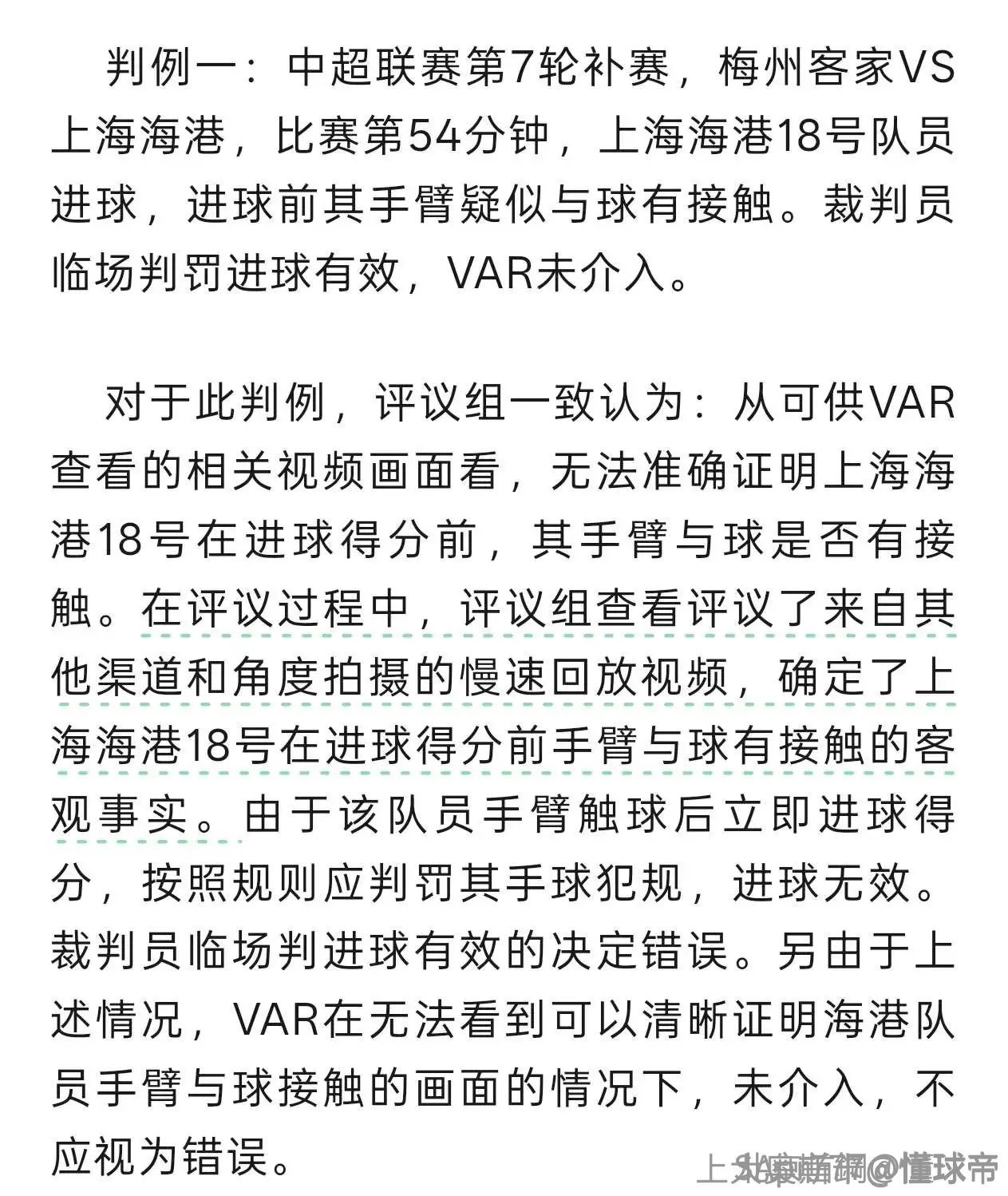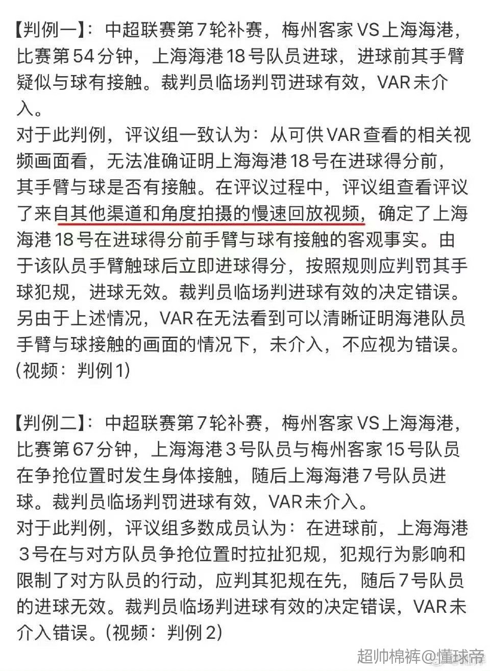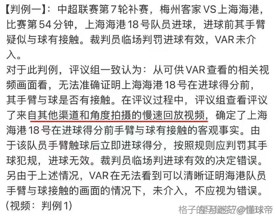 海港那场第三方视频是可以证实确定手球了的,而蓉城这场第三方视频也无法证实是否100%手球。所以认定主裁第一判罚 解释的还不够清楚吗?