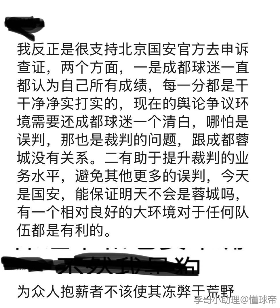 转发四川群里老哥的一句话。这件事本身就是国安球迷针对足协,后面不知道为啥变成两边球迷互喷起来了。23年我记得国安球迷还给我们送了鼓,还一起唱歌喷了足协。我看这个申明就是写的现场视角无法判断,确实有些角度看着像手球了,我们这边有些角度又看着没像手球。不代表我们赢了,更不代表正义必胜。。。。只是现在技术还无法判断,如果我们之后碰到这种情况,我们也会是一样的反应,包括去年我们也觉得被裁判黑了,当时我们心头啥感受。Peace