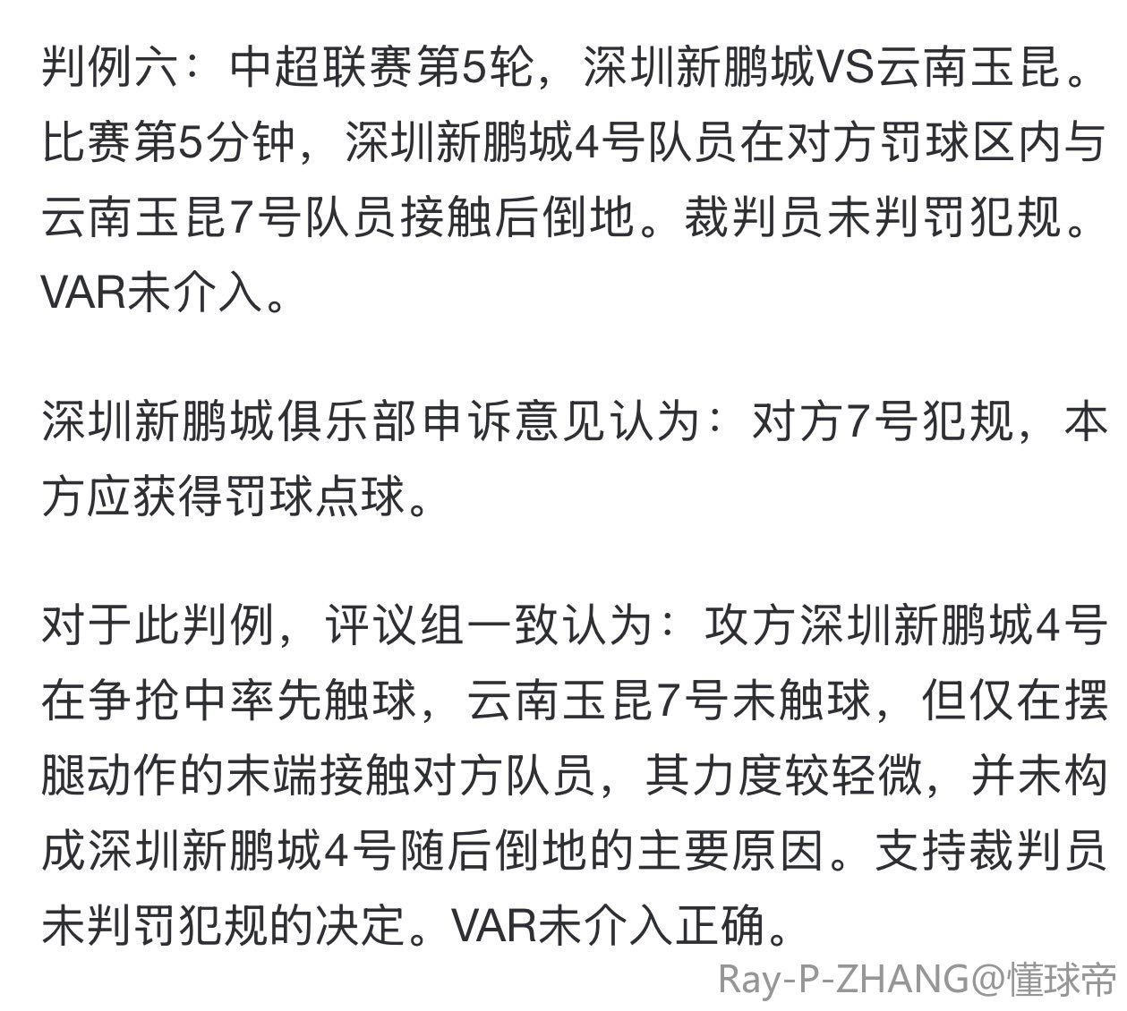 判例六:中超联赛第5轮,深圳新鹏城VS云南玉昆。比赛第5分钟,深圳新鹏城4号队员在对方罚球区内与云南玉昆7号队员接触后倒地。裁判员未判罚犯规。VAR未介入。