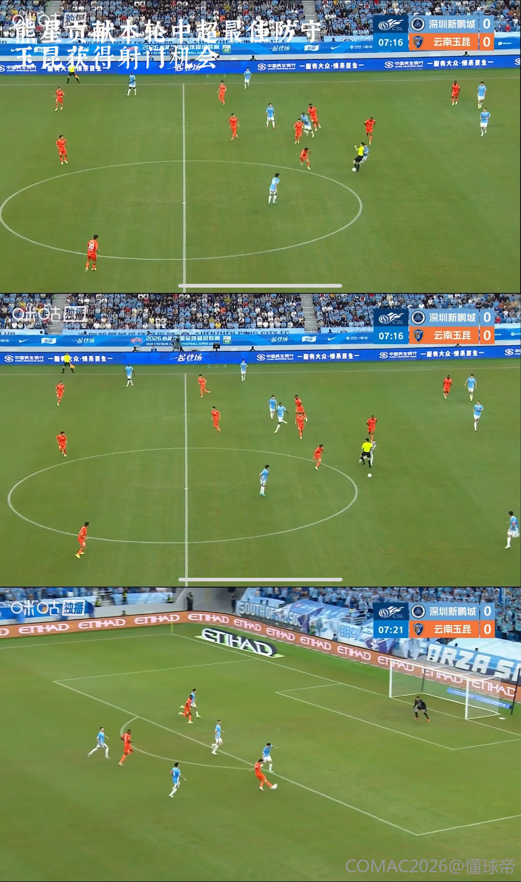 判例七:中超联赛第5轮,深圳新鹏城VS云南玉昆。比赛第26分钟,云南玉昆34号队员进球。裁判员初始判进球有效,经VAR介入,裁判员在场回看后,维持进球有效的初始决定。