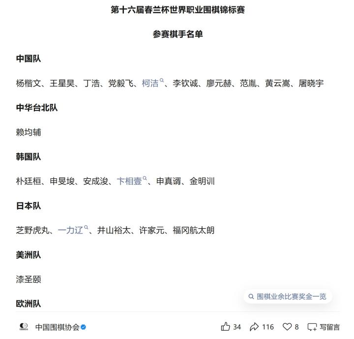 4月16日,中国围棋协会公布了第十六届春兰杯世界职业围棋锦标赛参赛棋手名单,前两轮比赛将于5月23日至25日在陕西西安进行。