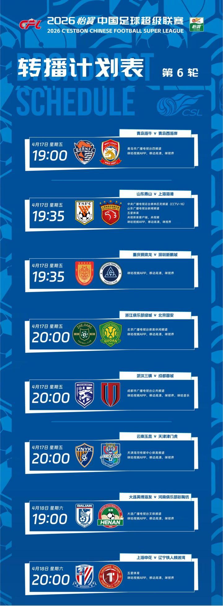 4月17日、18日,2026赛季中超联赛将展开第6轮角逐。赛前,中超官方发布了本轮转播计划表。根据转播计划,本轮8场比赛都有网络直播,7场比赛还有电视平台直播。