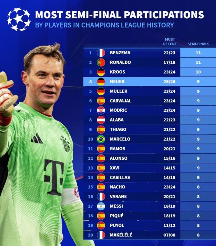 扫描下载懂球帝首页>动态> 参加欧冠半决赛次数球员榜:本泽马、C罗11次第1,诺伊尔9次