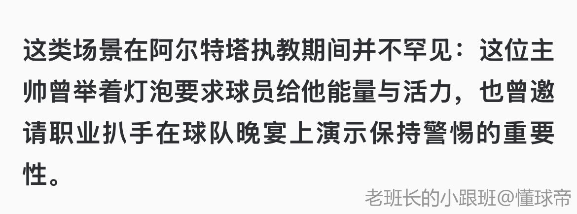 这类场景在阿尔特塔执教期间并不罕见:这位主帅曾举着灯泡要求球员给他能量与活力,也曾邀请职业扒手在球队晚宴上演示保持警惕的重要性。