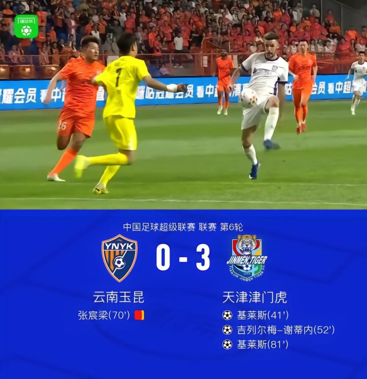 扫描下载懂球帝首页>动态> 津门虎3-0十人云南,基莱斯双响,谢蒂内传射,张宸梁染红