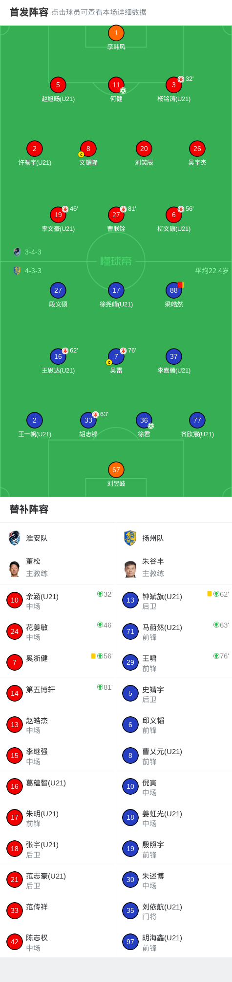 北京时间4月18日江苏省城市足球联赛 联赛 第2轮,淮安队主场对阵扬州队。淮安队何健破门。扬州队徐君破门。最终比分淮安队 1-1 扬州队。
