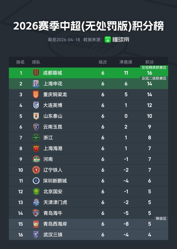 扫描下载懂球帝首页>动态> 中超无扣分积分榜:成都第一申花第二,天津首胜后升至第13