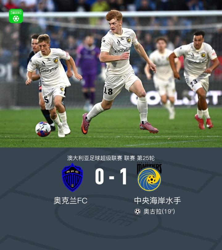 北京时间4月19日澳大利亚足球超级联赛第25轮,奥克兰FC主场对阵中央海岸水手。比赛中,中央海岸水手球员通过配合由奥古拉打入进球。最终比分奥克兰FC 0-1中央海岸水手。