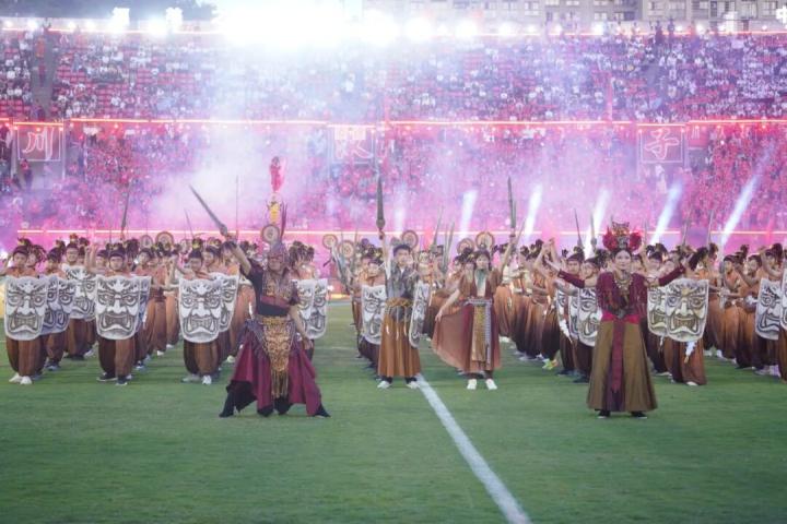 与凉山的厚重和辽阔相对应,成都则以说唱版《成都战歌》接棒亮相。这样的安排很巧妙:一边是深植山地文化与民族传统的原生态表达,一边是充满城市节奏与时尚活力的现代腔调。凉山与成都,在同一片绿茵场上完成了一次传统与潮流、民族与都市的隔空对话。