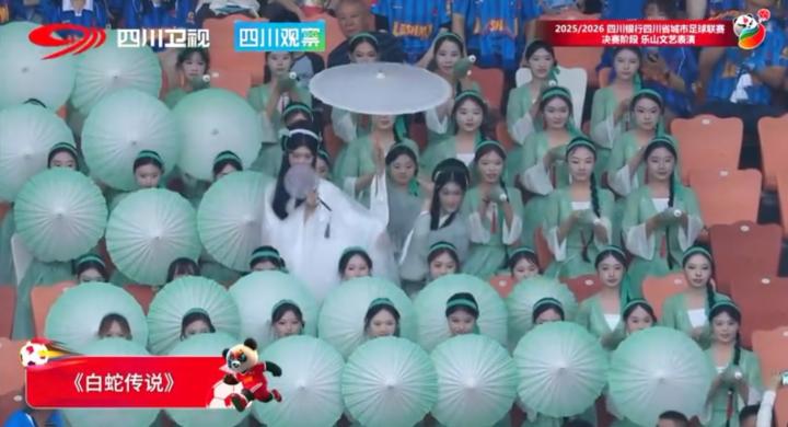 《白蛇传说》视觉大秀率先把球场变成了峨眉文化的沉浸式展厅。白蛇传说、峨眉山、千年佛国、浪漫想象,这些元素天然就具有极强的文化辨识度和观赏性。当传奇叙事进入现代赛场,乐山主场展现出来的,不是简单的“表演节目”,而是一种将山水、神话与城市IP融为一体的审美表达。