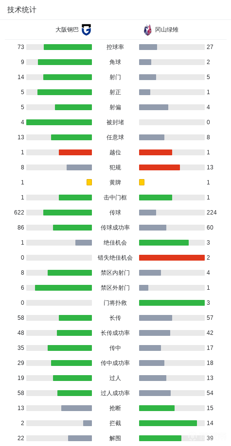 第5分钟,角球开到前点,东口顺昭不慎自摆乌龙,冈山绿雉1-0大阪钢巴