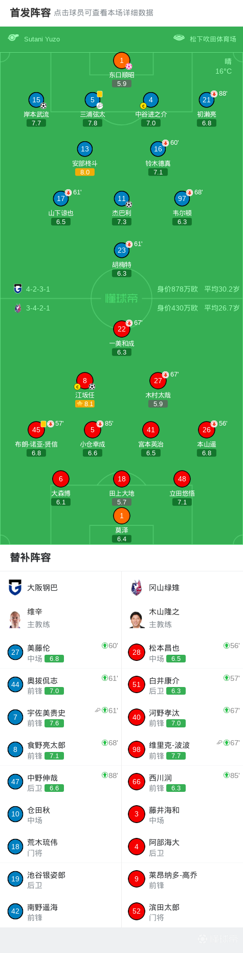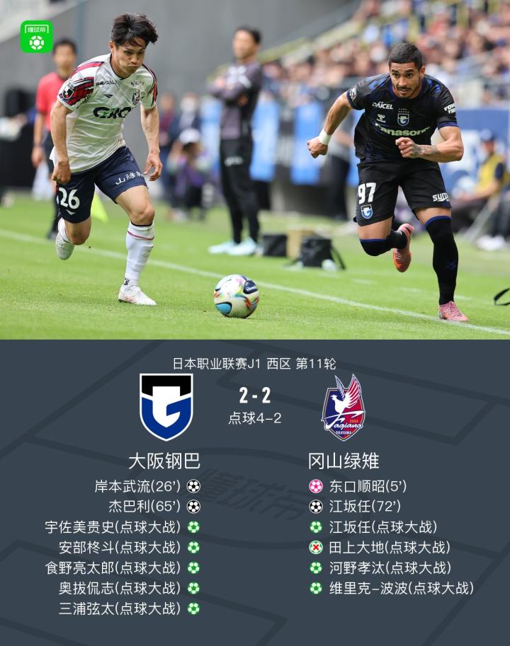 北京时间4月19日日本职业联赛J1 西区 第11轮,大阪钢巴主场对阵冈山绿雉。大阪钢巴岸本武流破门,杰巴利破门,东口顺昭自摆乌龙。冈山绿雉江坂任破门。最终比分大阪钢巴 6-4 冈山绿雉。