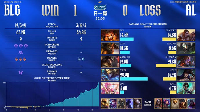 4月19日,LPL第二赛段,BLG 2-0战胜AL,拿到了自己的第五胜。