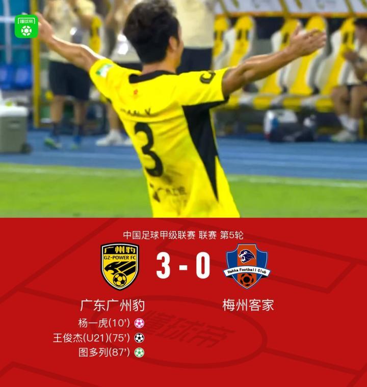 北京时间4月19日19:30,中甲第5轮,广东广州豹主场对阵梅州客家。上半场,韩轩造杨一虎乌龙;下半场,王俊杰破门,图多列点射。最终广东广州豹3-0完胜梅州客家。