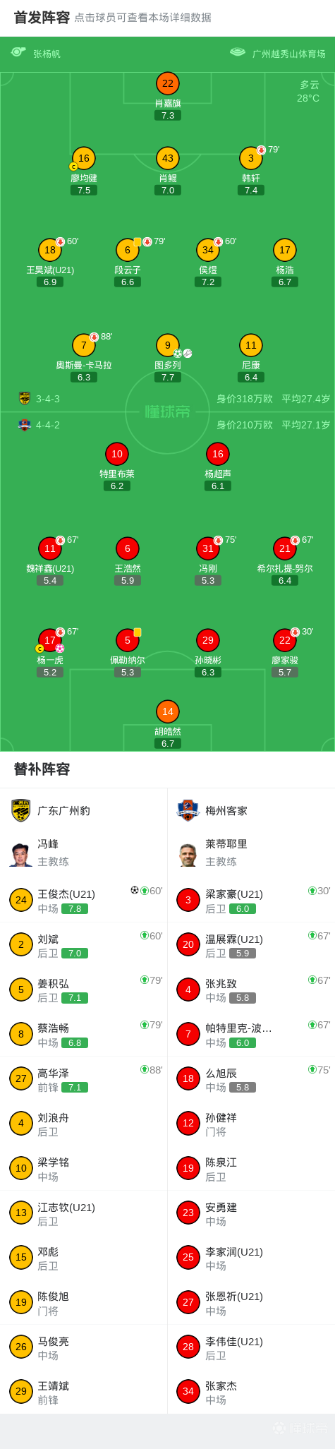第60分钟,广州豹率先做出换人,王俊杰、刘斌登场,换下王昊斌、侯煜