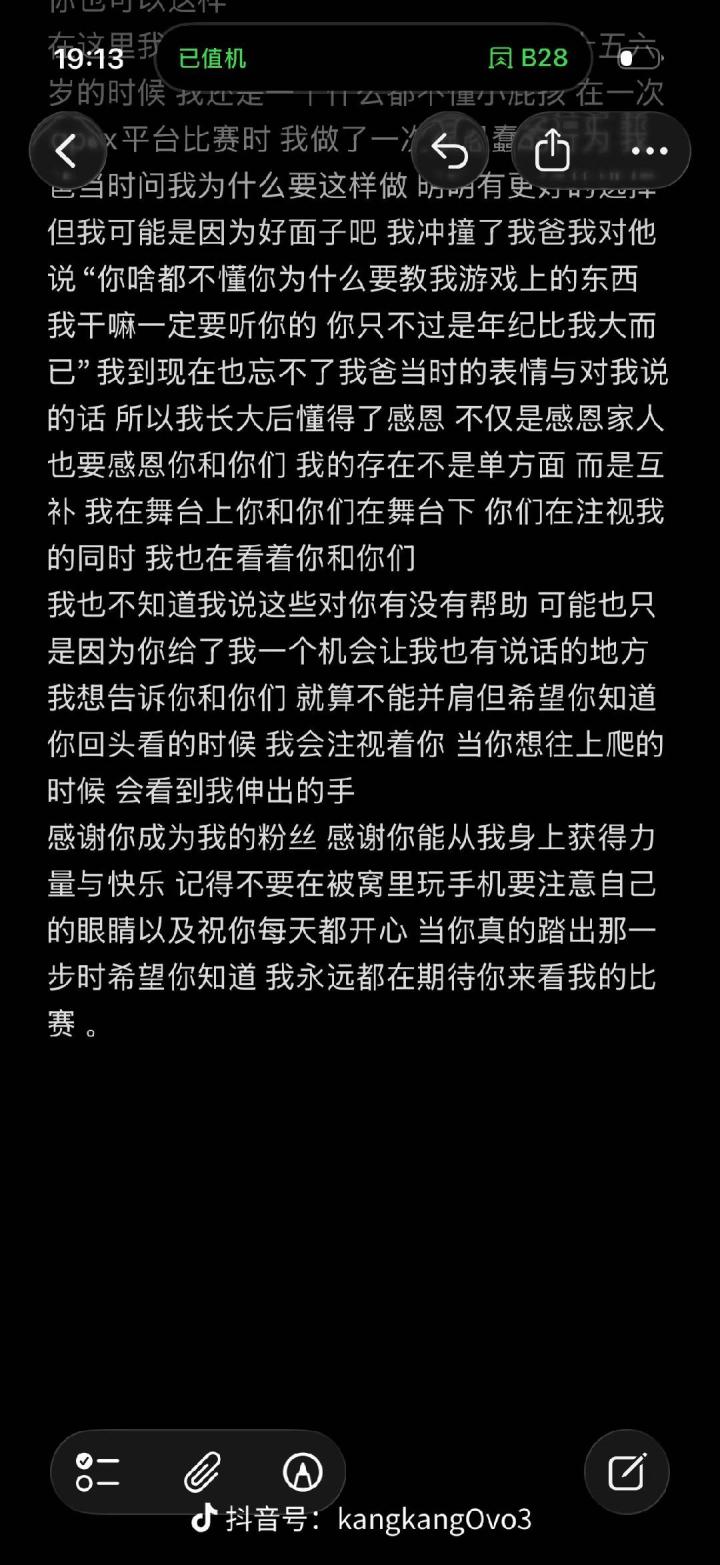 4月19日,EDG.ZmjjKK在粉丝写给自己的长信下方同样回复了一封长信,来回应粉丝对自己的支持以及喜爱。