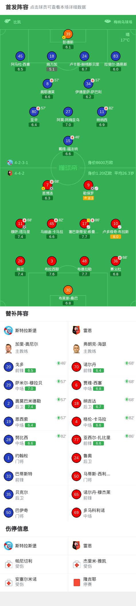半场战报:斯特拉斯堡0-1雷恩,勒保罗破门