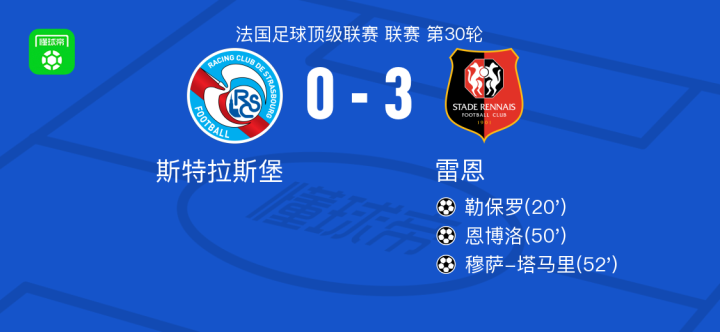 北京时间4月19日法国足球甲级联赛第30轮,斯特拉斯堡主场迎战雷恩。比赛中,勒保罗接队友传球率先破门,随后勒保罗助攻恩博洛扩大比分,紧接着穆萨-塔马里也成功破门。最终比分定格为斯特拉斯堡0-3雷恩。