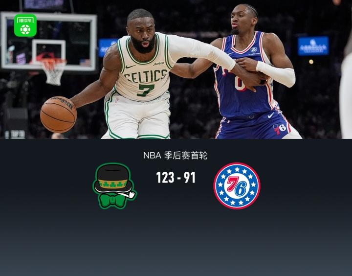 北京时间4月20日NBA 季后赛首轮G1,波士顿凯尔特人对阵费城76人。首节凯尔特人便依靠塔图姆强势发挥建立15分领先,半场凯尔特人64-46领先76人,下半场凯尔特人继续拉大分差,最终凯尔特人123-91大胜76人,大比分1-0领先。