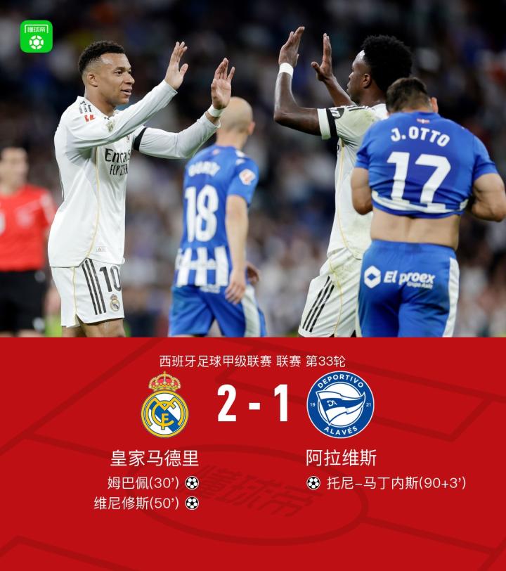 扫描下载懂球帝首页>动态> 剑南春丨皇马2-1阿拉维斯,姆巴佩、维尼修斯破门,米利唐伤退