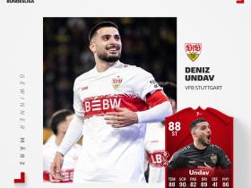 4场5球2助,斯图加特前锋昂达夫当选德甲3月最佳球员