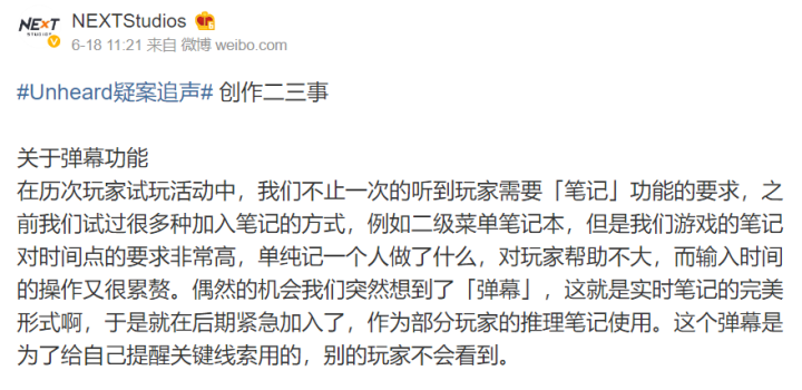 这种方法相较于单纯的笔记系统更加便捷,弹幕等同笔记的做法非常适合《疑案追声》这种通过时间轴来进行流程的游戏,又让我看到了弹幕的一种新的可能性。
