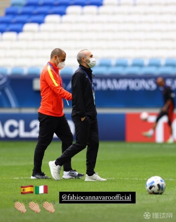 伊涅斯塔在个人社媒cue卡纳瓦罗,并贴上西班牙和意大利的国旗,以及鼓掌的表情,似乎在说很高兴和你相遇在球场。