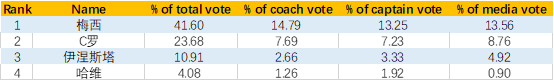 金球奖前四名没有什么争议。梅西虽然集体荣誉少,但个人表现对所有其他球员都碾压。从投票结果,梅西获得了41.6%超高支持率,在教练、队长和媒体投票中均稳居第一,金球奖当之无愧。而C罗C罗虽然没能在欧洲杯上有所斩获,但个人数据很好,在投票中稳居第二。伊涅斯塔比哈维在欧洲杯上表现地好,所以优于哈维是合理的。