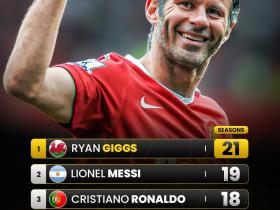 职业球员连续赛季进球纪录:瑞恩·吉格斯以21个赛季位居榜首