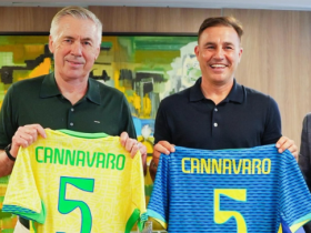 卡纳瓦罗造访巴西足协并与安切洛蒂合影,他正在巴西推广香水