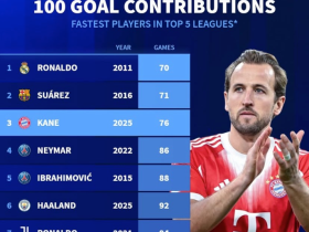 本世纪五大联赛参与百球最快TOP10:C罗70场第1,苏牙71场第2